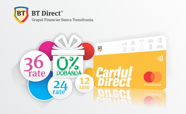 Produsul financiar “Rate fara Dobanda” are o perioada de creditare de 12 rate pentru un pret de raft intre 2.000 – 3.999 lei /, 24 rate pentru un pret de raft intre 4.000 – 5.999 lei /, 36 rate pentru un pret de raft intre 6.000 lei - 40.000 lei. Exemplu reprezentativ: Costurile de finantare prin BT Direct sunt: DAE 7,98%/3,34%/2,08%, calculata pentru un pret de raft de 2.000 lei/4.000 lei/6.000 lei in 12/24/36 rate lunare, dobanda anuala fixa 0%, comision de emitere card 30 lei, comision administrare lunar 4,5 lei, iar rata lunara este de 171,17 lei / 171,17 lei / 171,17 lei, valoarea totala de plata fiind 2.084 lei /4.138 lei /6.192 lei. Detalii suplimentare la birourile de creditare BT Direct din incinta magazinelor Dedeman. Oferta valabila in perioada 12.09 – 15.10.2019.